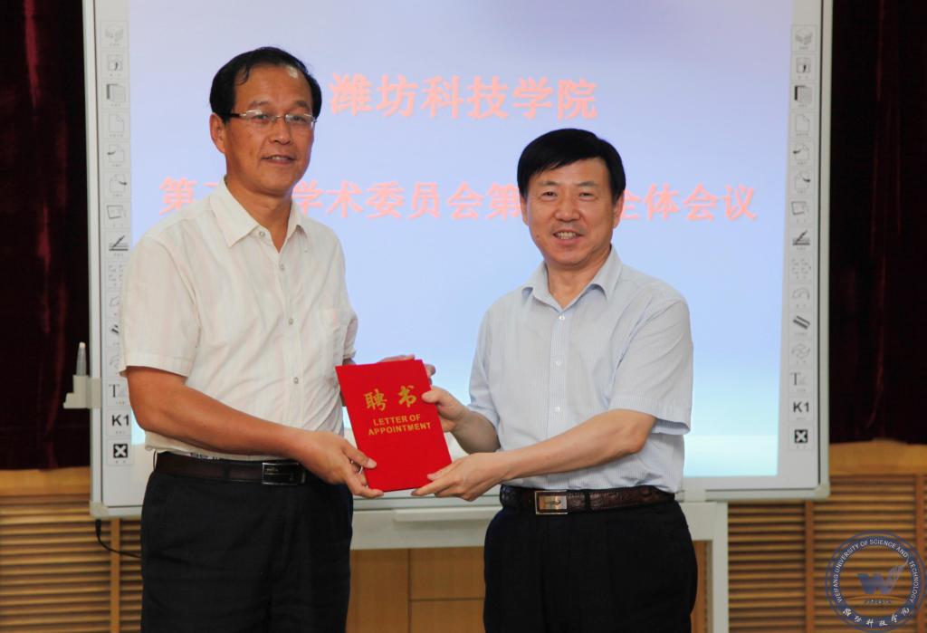 吴长军主持会议并宣读了《潍坊科技学院关于印发第三届学术委员会组成人员的通知》及第三届学术委员会委员名单(共29人),李昌武为学术委员会每一位委员颁发了聘书,学术委员会主任薛彦斌博士代表学术委员会作了表态发言,李昌武作了重要讲话。