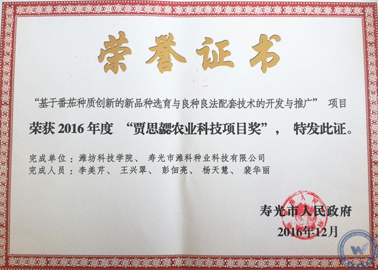 李美芹博士主持完成的科技成果《基于番茄种质创新的新品种选育与良种良法配套技术的开发与推广》获贾思勰农业科技项目奖。