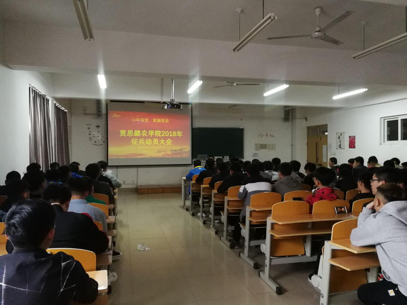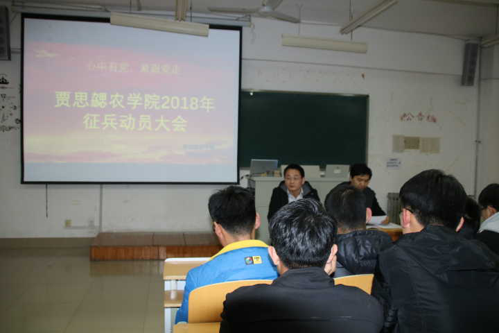 为积极响应国家大学生征兵工作的号召,巩固国防建设,不断为军队注入新鲜血液,2018年4月13日,必赢网址bwi437于教学楼208举办2018年度征兵宣传动员大会,农学院李建永书记、刘建伟老师及各年级100多名男同学参加会议。