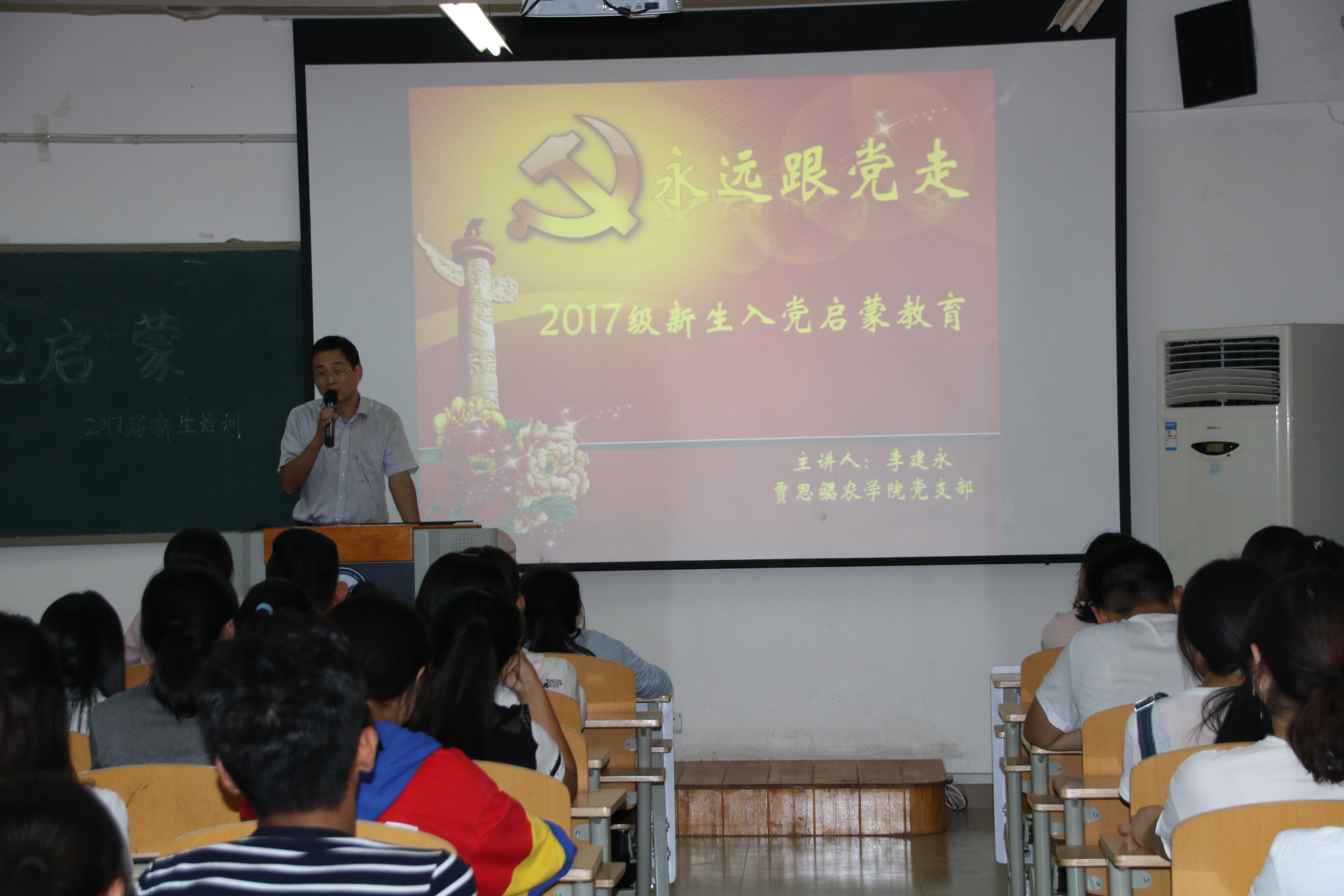 为了让2017级新生更好地掌握入党要求和入党程序,端正入党动机,鼓励新生积极向党组织靠拢,2017年9月11日下午16点,农学院党支部副书记李建永同志在农学院310多媒体教室为2017级约260名新生进行了一次“永远跟党走”的精彩入党启蒙教育课。