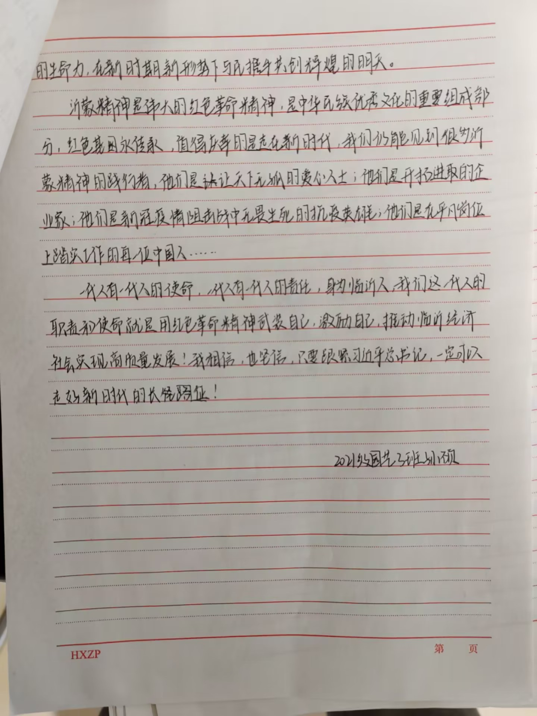 沂蒙精神是伟大的红色革命精神,是中华民族优秀文化的重要组成部分,同学们通过文章的形式以“弘扬沂蒙精神,践行初心使命”“沂蒙精神,薪火相传”等为主题,充分认识到作为新时代青年,应深知幸福的生活来之不易,应无比珍惜,要时刻铭记先辈们艰苦奋斗、爱党爱军的历史,学好本领,建设家乡,弘扬爱国主义精神,并以此引导身边的同学立足本职岗位,争创时代伟业,奋斗青春、不负韶华,追逐梦想、不负时代,走好新时代的长征路!